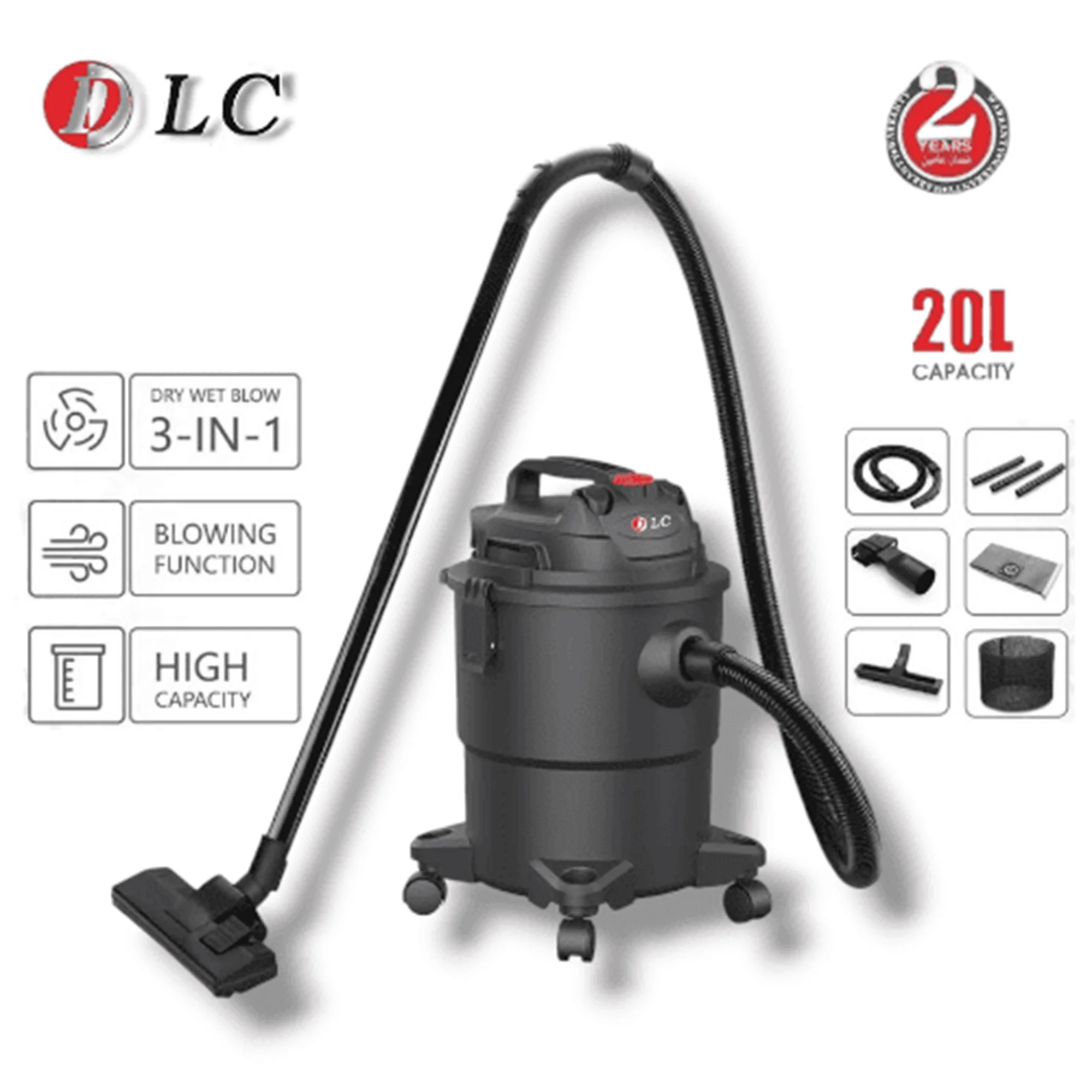 مكنسة جاف ورطب 20 لتر من DLC بقوة شفط عالية، مناسبة لتنظيف السوائل والأتربة بكفاءة، مع ضمان سنتين.